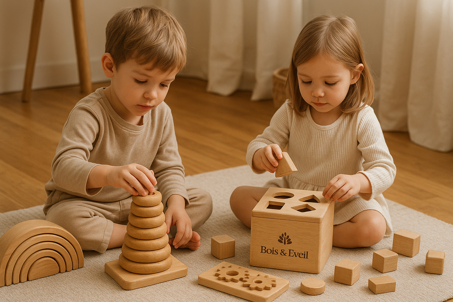Nous avons créé une collection de jouets Montessori 100% en bois, conçus pour :